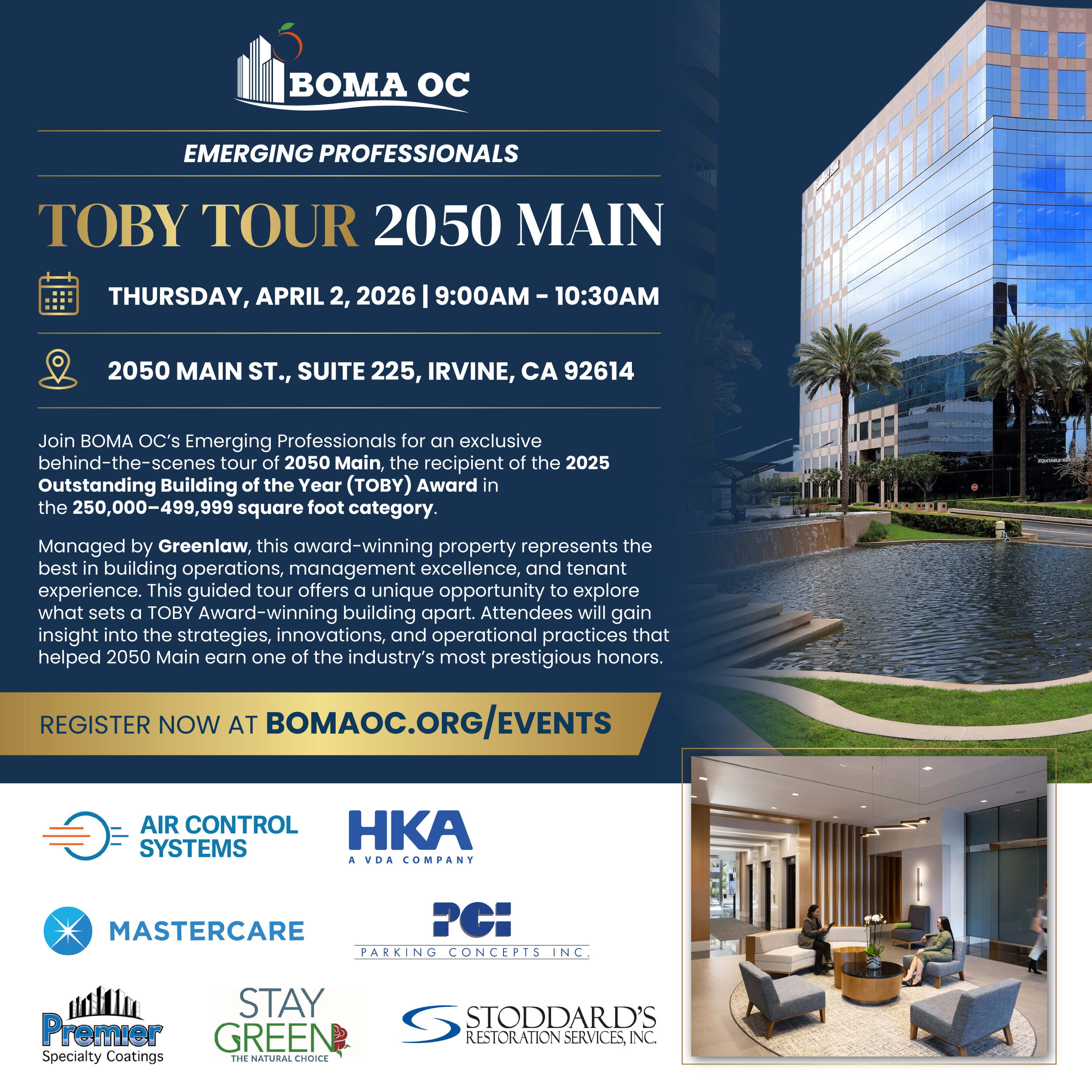 Join BOMA OC’s Emerging Professionals for an exclusive behind-the-scenes tour of 2050 Main, the recipient of the 2025 Outstanding Building of the Year (TOBY) Award in the 250,000–499,999 square foot category. Managed by Greenlaw, this award-winning property represents the best in building operations, management excellence, and tenant experience.