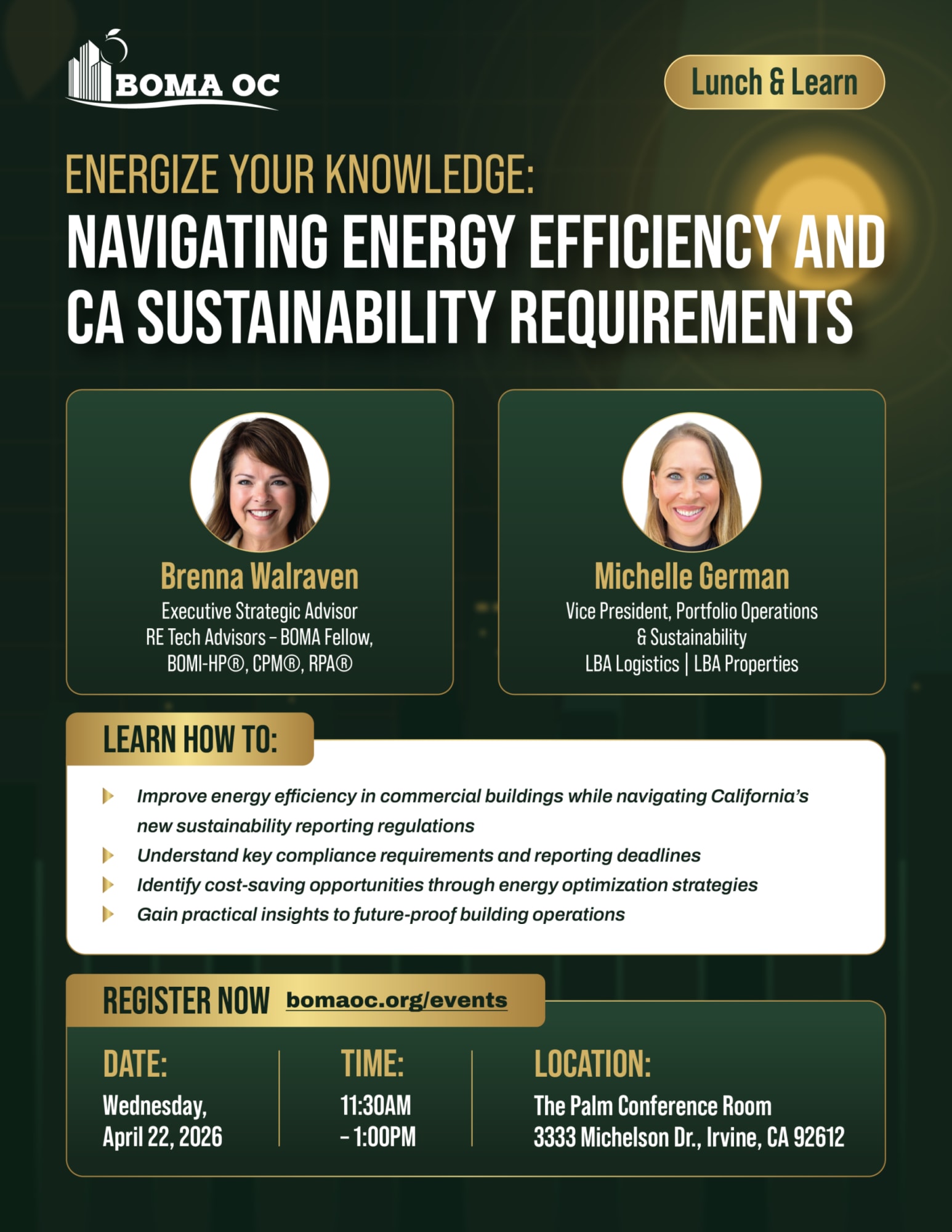DESCRIPTION:Speakers: Michelle German \nVice President Portfolio Operations & Sustainability \nLBA Logistics | LBA Properties Brenna Walraven \nExecutive Strategic Advisor \nRE Tech Advisors   BOMA Fellow\, BOMI-HP \, CPM \, RPA  Event Summary: Learn how to improve energy efficiency in commercial buildings while navigating California's new sustainability reporting regulations.  Understand key compliance requirements and reporting deadlines  Identify cost-saving opportunities through energy optimization strategies  Gain practical insights to future-proof building operationsThank you to our committee: Committee Chair(s) * Gary Bittner\, Melanie Lombardi Committee Members * Lindsey Rodriguez\, Lindsey Roshto\, Nicole Janzen\, Karla Ochoa de la Torre\, Alicia O'Malley