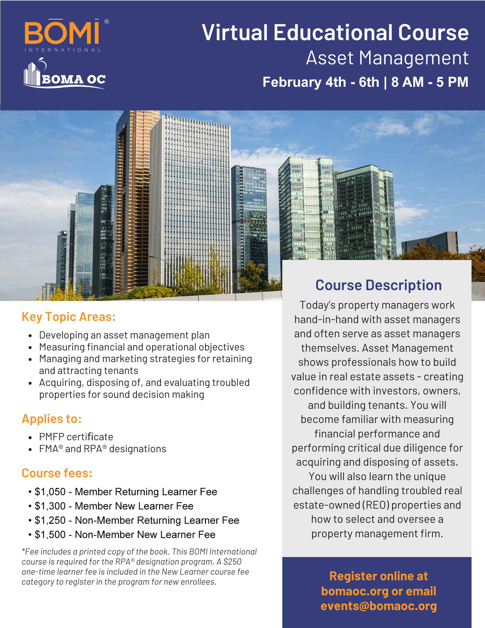 Key topic areas: developing an asset management plan, including appropriate resources associated with the current economy • measuring financial and operational objectives, including audits and reasons for them • managing and marketing strategies for retaining and attracting tenants • acquiring, disposing of, and evaluating troubled properties for sound decision making